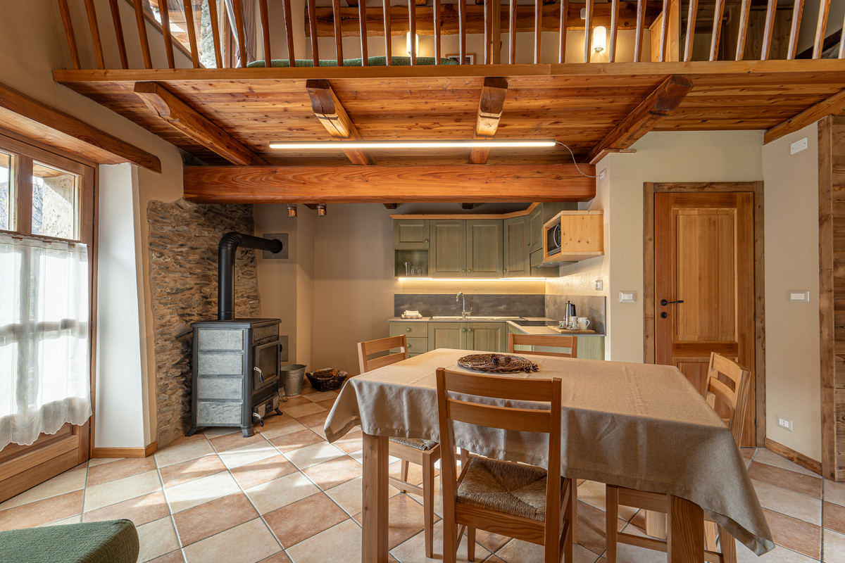L’accès au logement du « civico » n. 1 s’effectue par le jardin jusqu’en face qui offre une vue magnifique sur la forêt de mélèzes. Depuis le balcon orienté plein sud, il est possible d’admirer les sommets de la vallée de Marmora, le « Col Intersile », « La Bianca » et « Rocca la Meja ». L’appartement dispose d’une pièce de vie avec canapé-lit, d’une cuisine moderne équipée avec des plaques électriques, réfrigérateur, évier et vaisselle. Une magnifique sous pente en bois abrite la chambre à coucher apte à recevoir jusqu’à 4 personnes. La zone nuit est équipée avec un confortable lit double, ou bien deux lits simples et un lit superposé pour adultes. Dans une maison de montagne on ne peut pas manquer d’un poêle à bois pour chauffer le logement et d’une salle de bains avec eau chaude et douche. Une connexion internet gratuite est disponible. Dans ce logement, les animaux sont acceptés